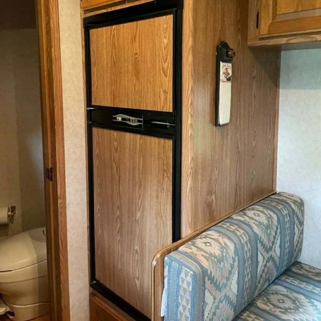 • Inside has solid oak cabinets – plenty of storage space, lighted cabinets, 6.0 cubic frig/freezer runs on AC or LP, 3 burner stove & oven, stereo & CD player, microwave, ducked throughout for AC & heat, furnace runs on electric or LP.
